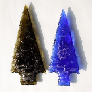 これは古代槍穂先のレプリカで、長さは10㎝と11㎝です。ただし黒曜石ではなくて、酒瓶ガラスを...