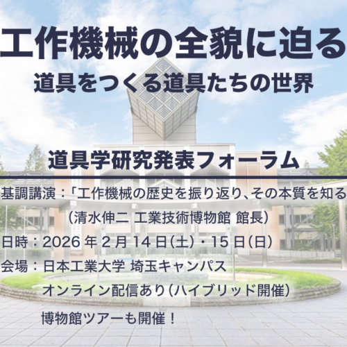 2025年度 道具学研究発表フォーラム(2026年2月開催) カテゴリー お知らせ 今年度の道具学研究発表フォーラムは、日本工業大学(担当:細田彰一教授)埼玉キャンパスでの開催... READ MORE 2025年度 道具学研究発表フォーラム(2026年2月開催)