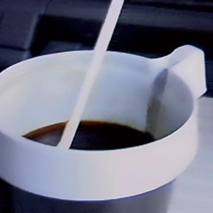 このカップは、薄い樹脂の真空成形からなる白色の上半分とコーヒー色の下半分の底部分から構成され...