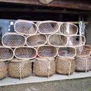 長良鵜飼の鵜籠は2種類。楕円形の鳥屋籠(寝床用)と円形で桧製蓋・脚付の鵜籠(鵜の運搬用で鵜舟...