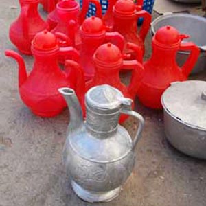 ウズベキスタンの古都、ヒヴァの市場で買い手を待つアルミ鋳物の水差しと赤いプラスチックの水差し...