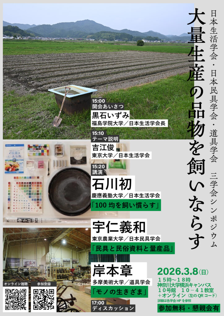 2026年3月8日(日)に、神奈川大学横浜キャンパスにて、日本生活学会・日本民具学会・道具学会 三学会シンポジウム共催シンポジウム「大量生産の品物を飼いならす」が開催されます。本学会からは岸本章氏が登壇予定です。